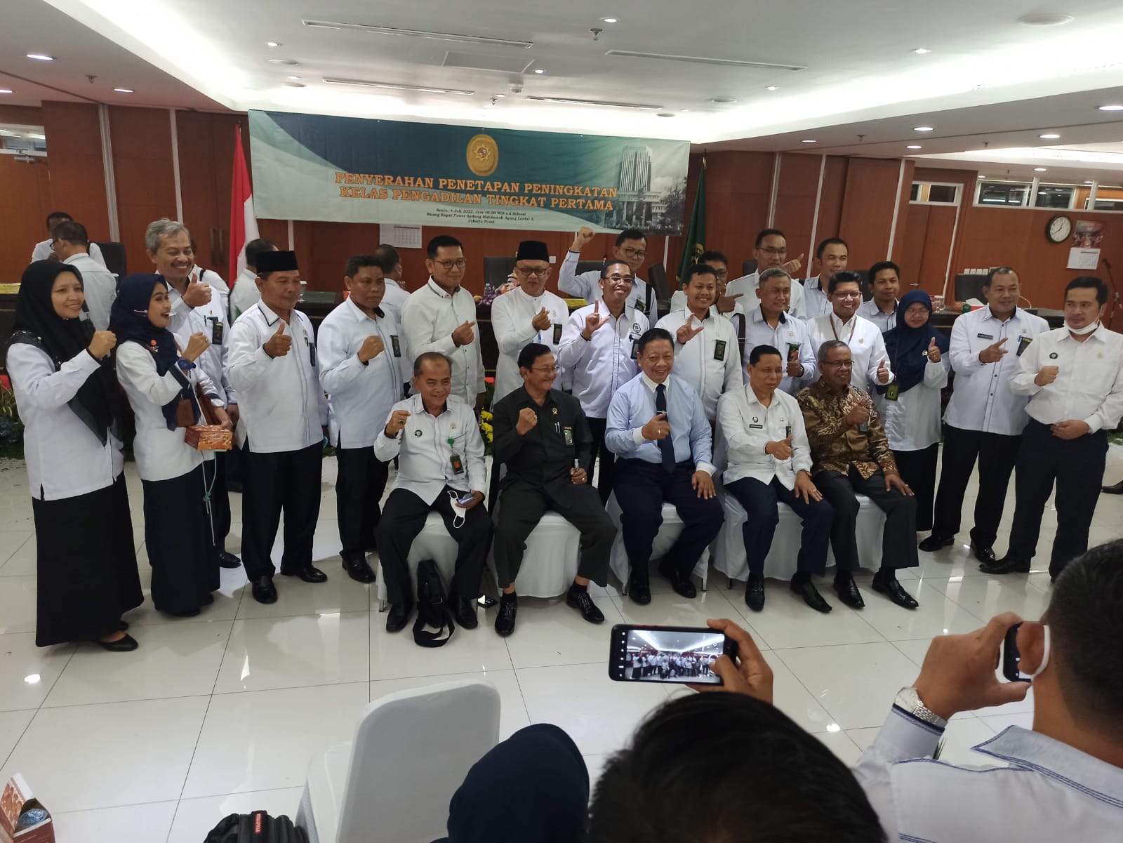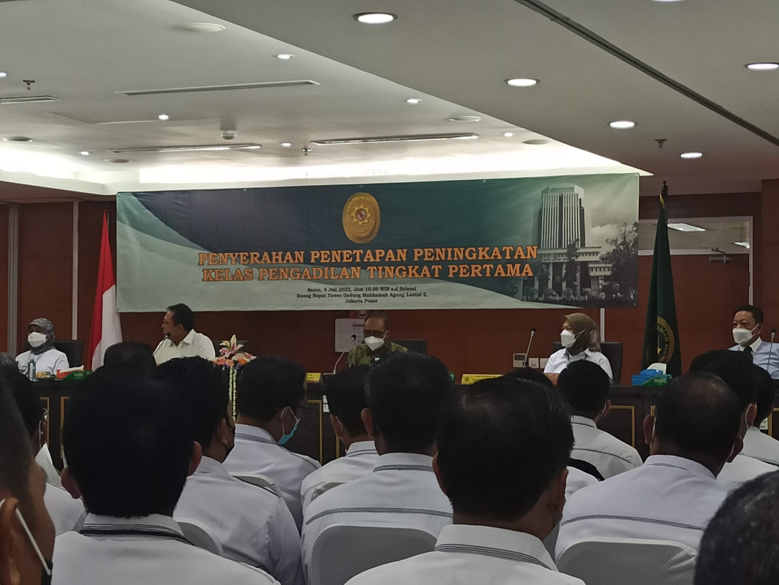 Wakil Ketua Mahkamah Agung RI Bidang Non Yudisial Yang Mulia Dr. H. Sunarto, S.H., M.H. dalam sambutannya menyampaikan bahwa kegiatan yang dilaksanakan pada hari ini adalah merupakan momentum yang sangat penting bagi sejarah peradilan, khususnya bagi pengadilan yang hari ini hadir secara langsung untuk menerima surat keputusan sebagai bentuk apresiasi atas keberhasilan dalam peningkatan kelas. Lebih lanjut disampaikannya, bahwa perolehan prestasi ini bukanlah hal yang sangat mudah, karena melalui proses perjuangan yang cukup panjang dimana satuan kerja yang mengajukan usulan kenaikan kelas mempersiapkan segala sesuatunya mulai dari pemenuhan dokumen terkait data hingga verifikasi kelayakan.