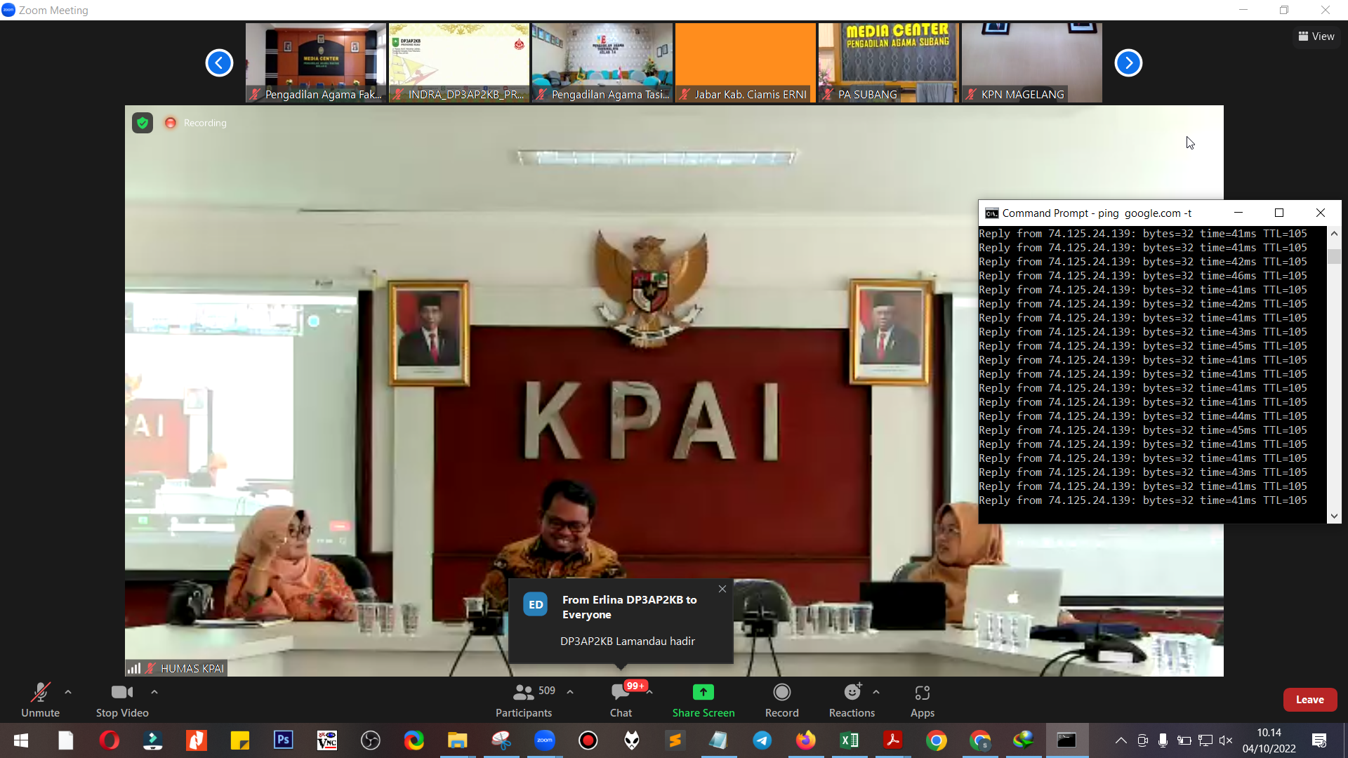 Selasa, 4 Oktober 2022 | Bertempat di ruang Media Center Pengadilan Agama Sidenreng Rappang, ibu ketua Pengadilan Agama Sidenreng Rappang HJ. Hidayani Paddengngeng, Lc., M.H mengikuti acara zoom yang diselenggarakan oleh Komisi Perlindungan Anak Indonesia (KPAI) dalam acara “ Advokasi Hasil Pengawasan Pemenuhan Hak Pengasuhan Anak Pada Orang Tua Tunggal, Berkonflik dan Bercerai “