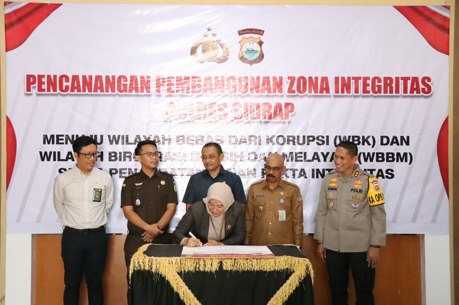 Setelah sambutan Kapolres Sidrap bersama Bupati Sidrap diwakili, Dandim 1420 Sidrap, Ketua DPRD diwakili, Ketua Pengadilan Negeri diwakili, Pengadilan Agama, Ketua Kejaksaan diwakili menandatangani Pakta Integritas Pencanangan Pembangunan ZI untuk menguji WBK dan WBBM.