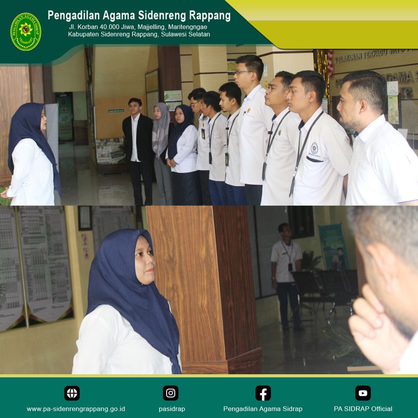 Sidenreng Rappang | 28 Agustus 2023, Briefing pagi oleh Hakim Pengadilan Agama Sidenreng Rappang, Ibu Syaraswati Nur Awalia, S.Sy. kepada petugas Pelayanan Terpadu Satu Pintu (PTSP). Briefing kali ini mengingatkan kepada petugas PTSP tentang 5S Senyum Salam Sapa Sopan Santun, serta menjaga integritas dalam memberikan pelayanan kepada para pihak pencari keadilan.