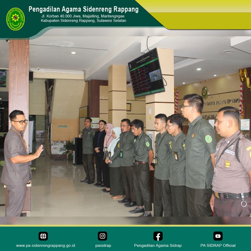 Sidenreng Rappang | 30 Agustus 2023, Briefing pagi oleh hakim Pengadilan Agama Sidenreng Rappang, Bapak Heru Fachrurizal, S.H.I. kepada petugas Pelayanan Terpadu Satu Pintu (PTSP). Briefing kali ini mengimbau kepada petugas PTSP untuk menyampaikan keluhan dan kendala yang dihadapi dalam proses administrasi perkara agar kedepannya lebih baik lagi. Selain itu, beliau menyampaikan untuk selalu berkoordinasi dan berkonsultasi jika mengalami kendala dalam pelaksanaan tugas sehingga dapat memberikan pelayanan terbaik kepada para pihak pencari keadilan.