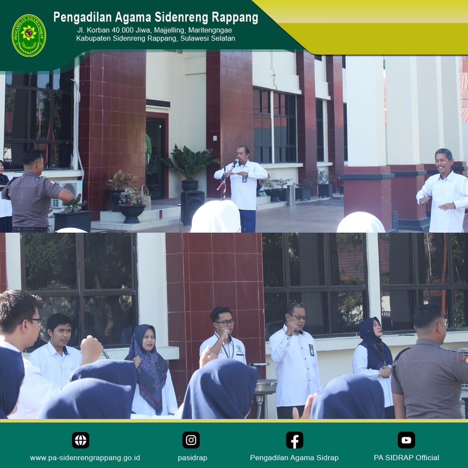 Sidenreng Rappang | 18 September 2023, Pengadilan Agama Sidenreng Rappang laksanakan Apel Senin pagi di Halaman Kantor Pengadilan Agama Sidenreng Rappang dengan pembina apel yaitu Panitera Pengadilan Agama Sidenreng Rappang, Bapak Shafar Arfah, S.H., M.H. yang diikuti pegawai Pengadilan Agama Sidenreng Rappang, Mahasiswa PPL Institut Agama Islam DDI Sidenreng Rappang dan Institut Agama Islam Negeri Parepare serta siswa PKL SMK Negeri 1 Sidenreng Rappang dan SMK Negeri 2 Sidenreng Rappang.