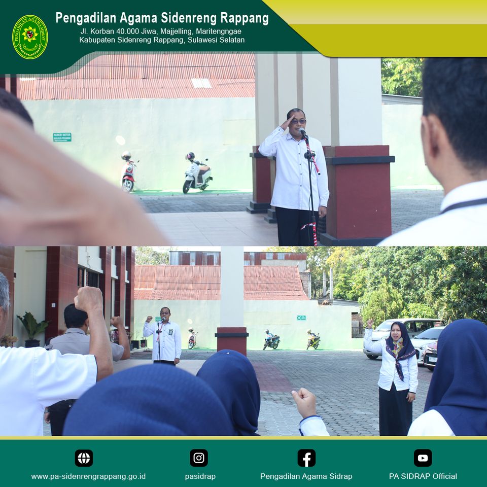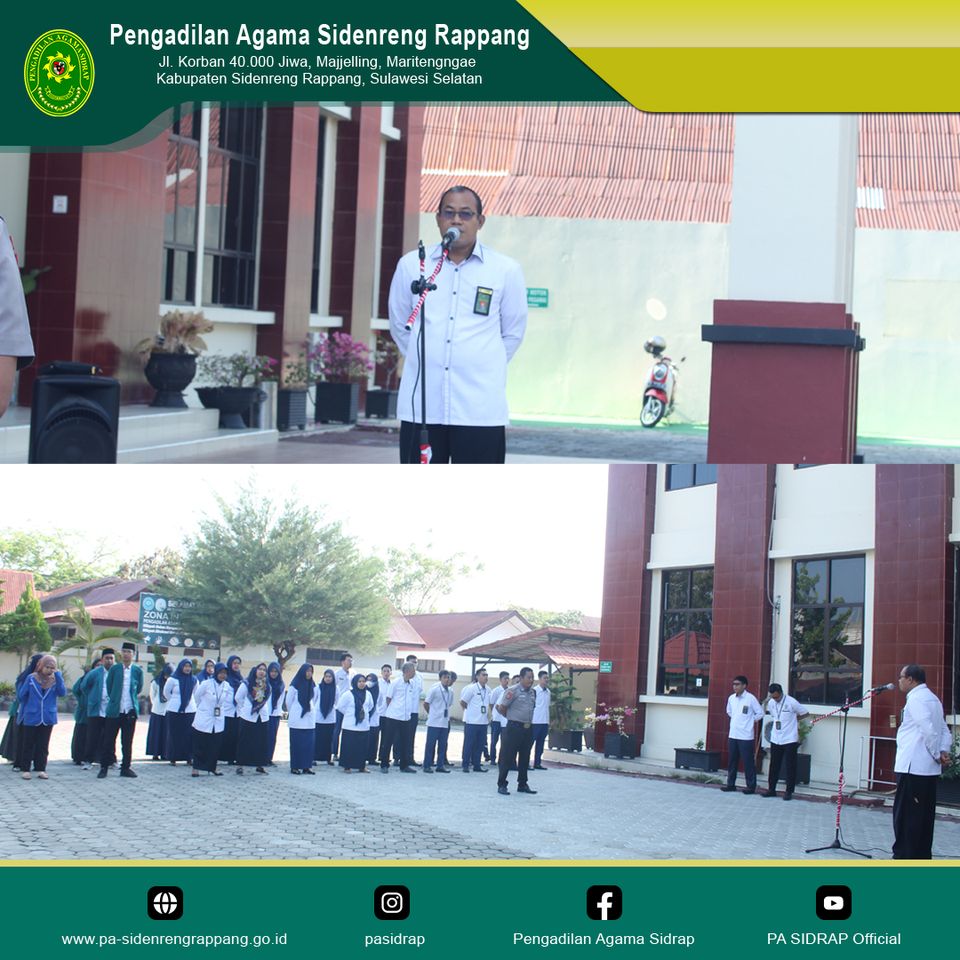 Sidenreng Rappang | 6 November 2023, Pengadilan Agama Sidenreng Rappang laksanakan Apel Senin pagi di Halaman Kantor Pengadilan Agama Sidenreng Rappang yang diikuti oleh aparatur Pengadilan Agama Sidenreng Rappang, Mahasiswa PPL Institut Agama Islam As'Adiyah Sengkang dan Mahasiswa KKN MBKM dari Institut Ilmu Sosial dan Bisnis Andi Sapada. Bertindak sebagai pembina apel, Wakil Ketua Pengadilan Agama Sidenreng Rappang, Bapak H. Jamaluddin, S.Ag., S.E., M.H. Pembina apel menyampaikan tentang integritas, peningkatan kualitas pelayanan, kebersihan, dan peningkatan kinerja. Apel Senin pagi ditutup dengan melakukan yel-yel Pengadilan Agama Sidenreng Rappang, Delapan Nilai Utama Mahkamah Agung dan core values ASN Berakhlak secara bersama-sama.